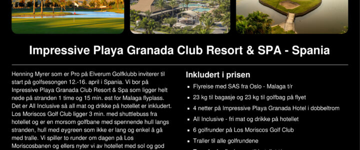 Vår pro Henning har fått til en kjempepris på en treningstur til Spania 12.-16. april. Turen går til Spania, en time øst for Malaga. Her vil vi bo på Impressive Playa Granada Hotel med all inclusive (mat og drikke). Det